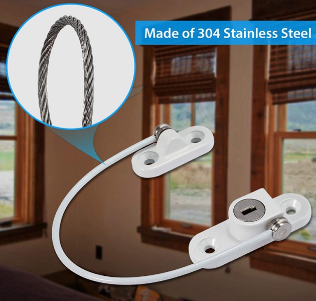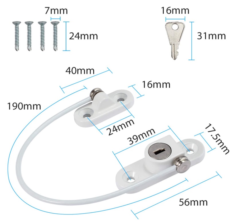 Window Wire Lock, Oval Model, White, W/SS-304 Wire - 190mm , W/Key Alike
