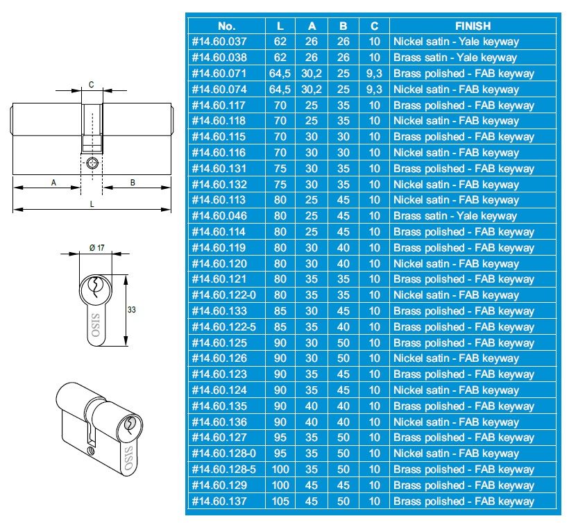 Profile Cylinder, Brass Polished, 64.5mm (30.2+9,3+25mm) FAB Key Way, W/3 SISO Metal Keys, W/Screw
