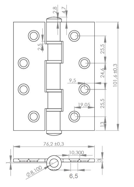 Butt Hinge, SS304, 102x76x3mm, W/4 SS304 Washers, No Ball Bearing, W/Stainless Steel Screws, W/SISO DK Logo