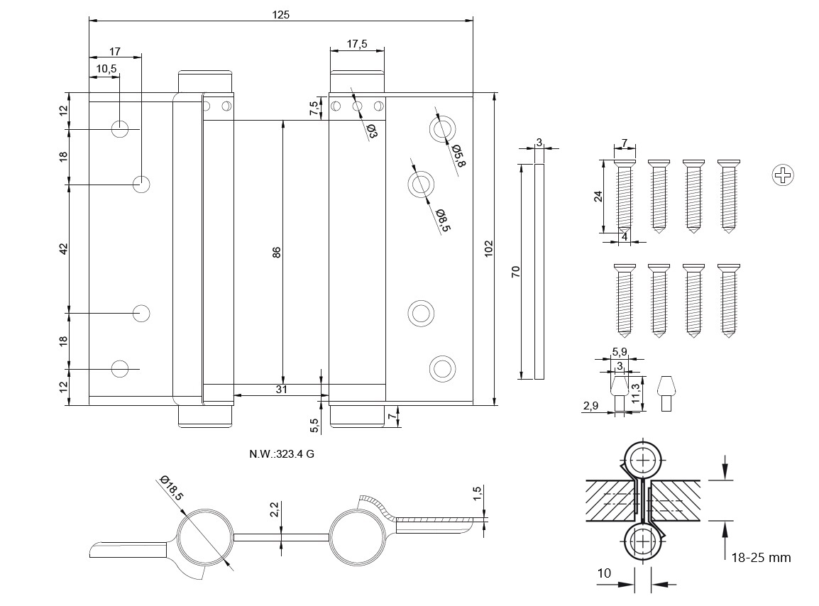 Saloon Door Double Action Spring Hinge, 102mm, SS304 Brushed For Door Thickness 18 to 25 mm, Max Door Weight 22KG