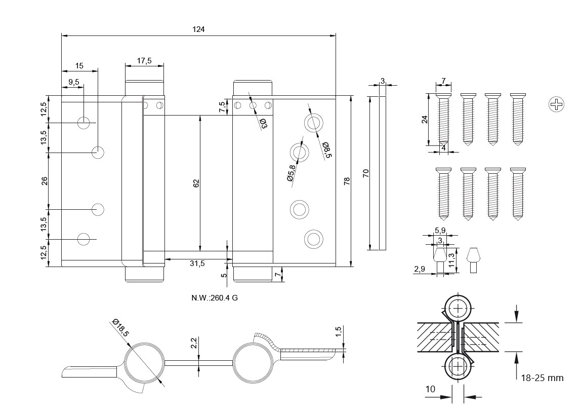 Saloon Door Double Action Spring Hinge, 78mm, SS304 Brushed For Door Thickness 18 to 25 mm, Max Door Weight 15KG