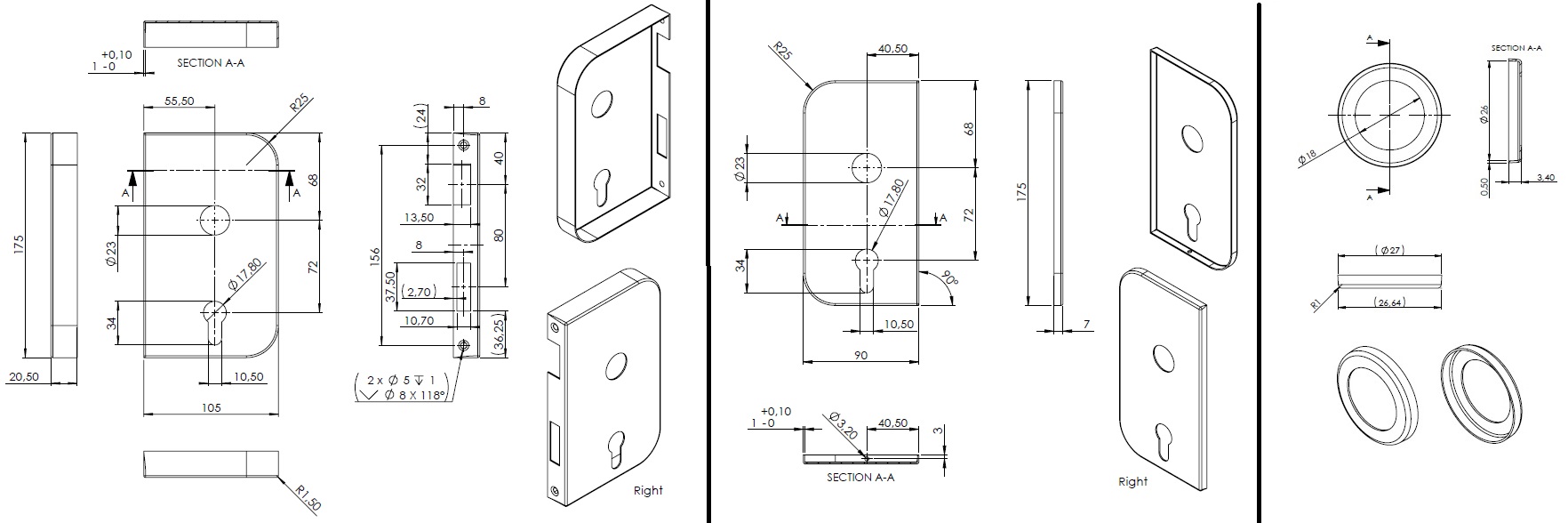 Cover Plates "Robin",W/Handle & Cylinder Hole, Right, Black Finish