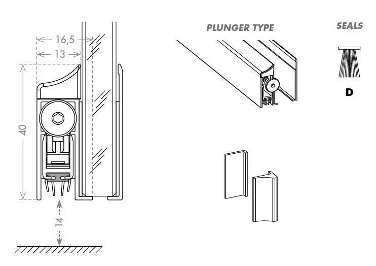 Drop Down Alu Profile, "D" ,F/Glass Doors,1030mm, W/Adhesive Tape, 40mm Profile Height, 14mm Drop Function,Can be shorten 150mm on the opposite Side to the Plunger, Tested to 200.000 closing Cycles, Anodized, 4 Fins Thermoplastic Seal (A)
