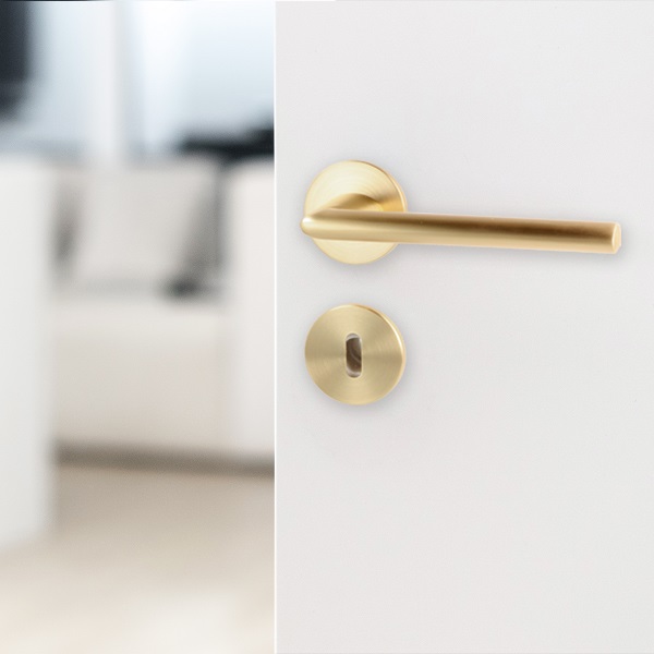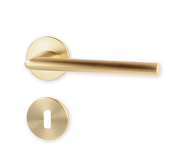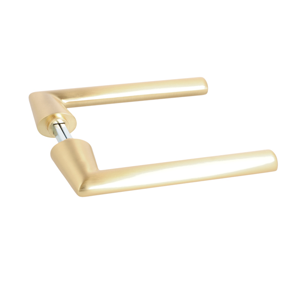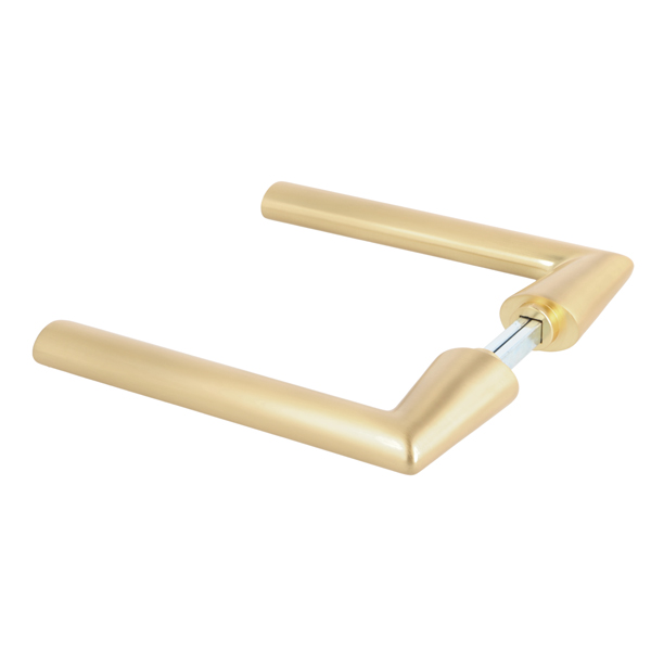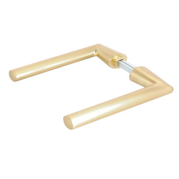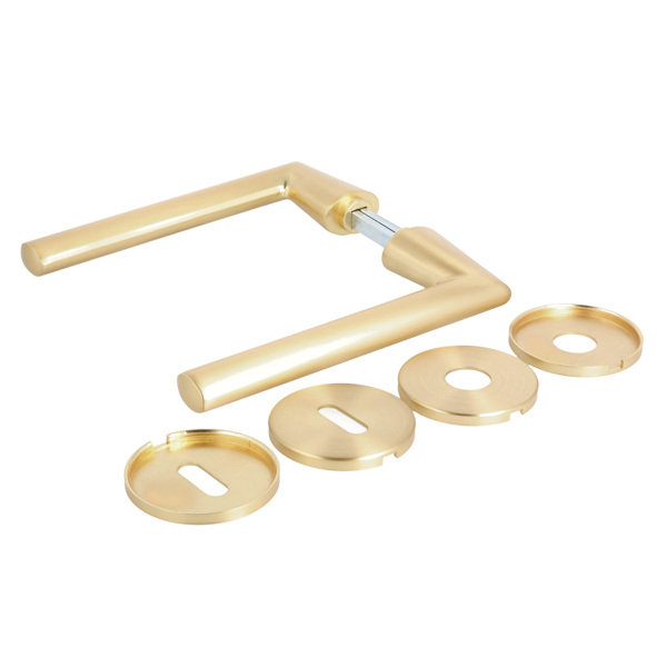 Zamak Door Handle "Jazz", Brushed Brass, 8x8x95mm Split Spindle, Incl. Round Spring Rosettes, Oval Key Hole Escutcheons, Hex Key, Wooden Screws, M4 Connecting Screws & Washers. cc: 38mm. Door Thickness: 38-50mm.