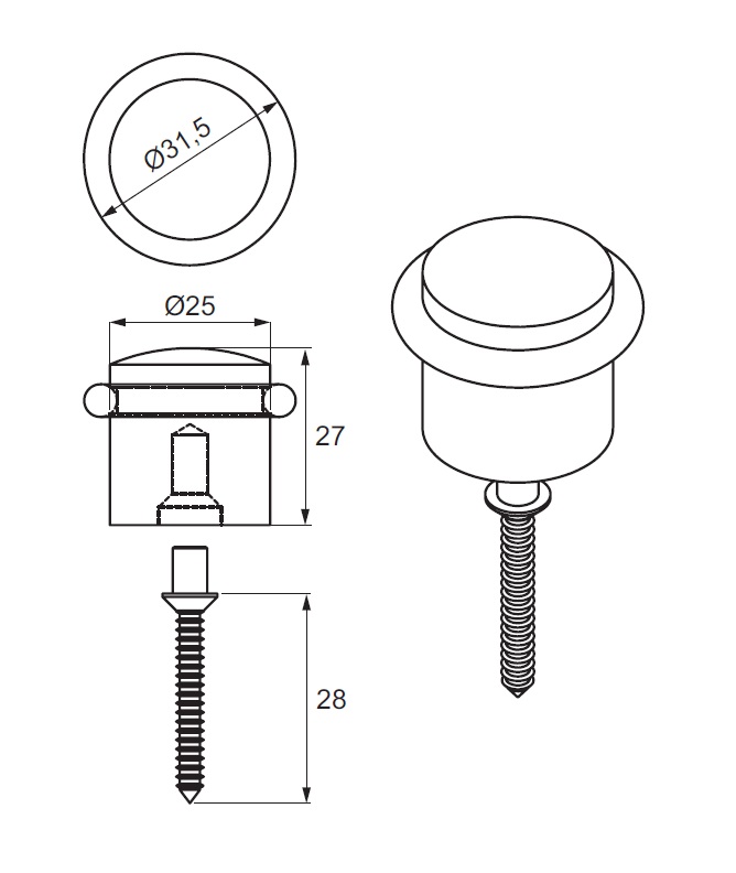 Door Stopper "Mushroom", ø25x27mm, SS201 Brushed, Incl.1 SS-201 Screw ø5x28mm & Floor Plug 38mm Lenght