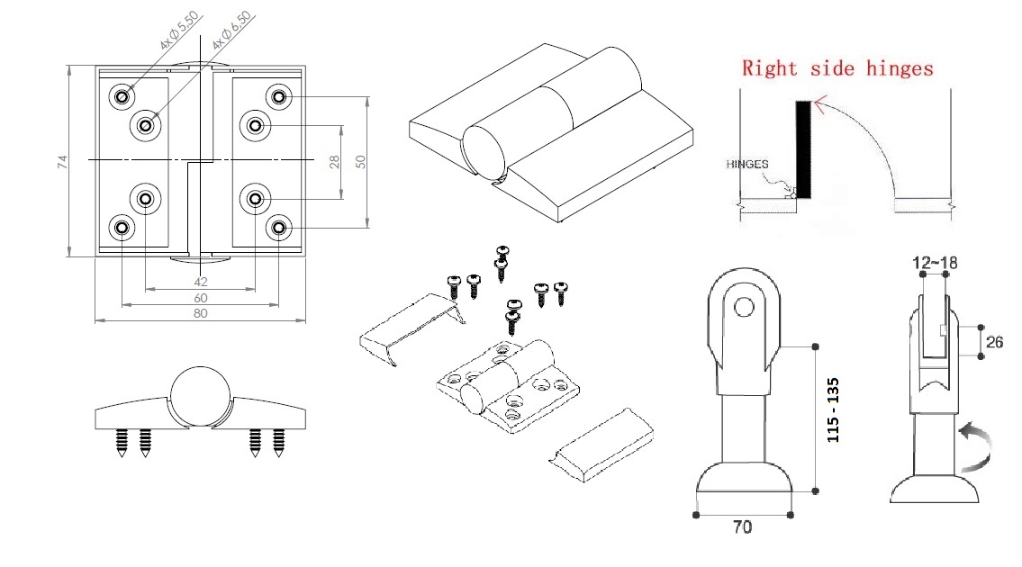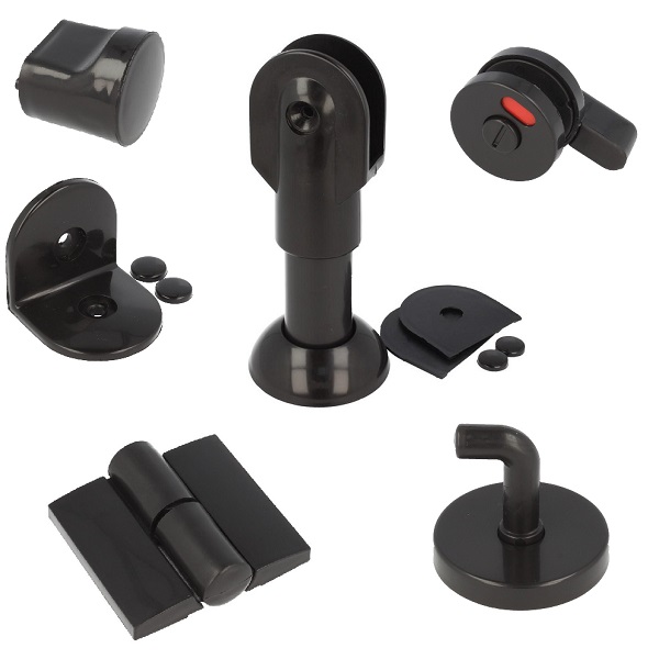 Toilet Cubicle Fit, Black, PP, Right, Leg 115-135mm,Consist off 2 Handles, 1 Hook , 1 Lock, 12 Angle Brackets, 2 Hinges & 2 Stands, F/12-18mm Panels, F/Right Hand Doors