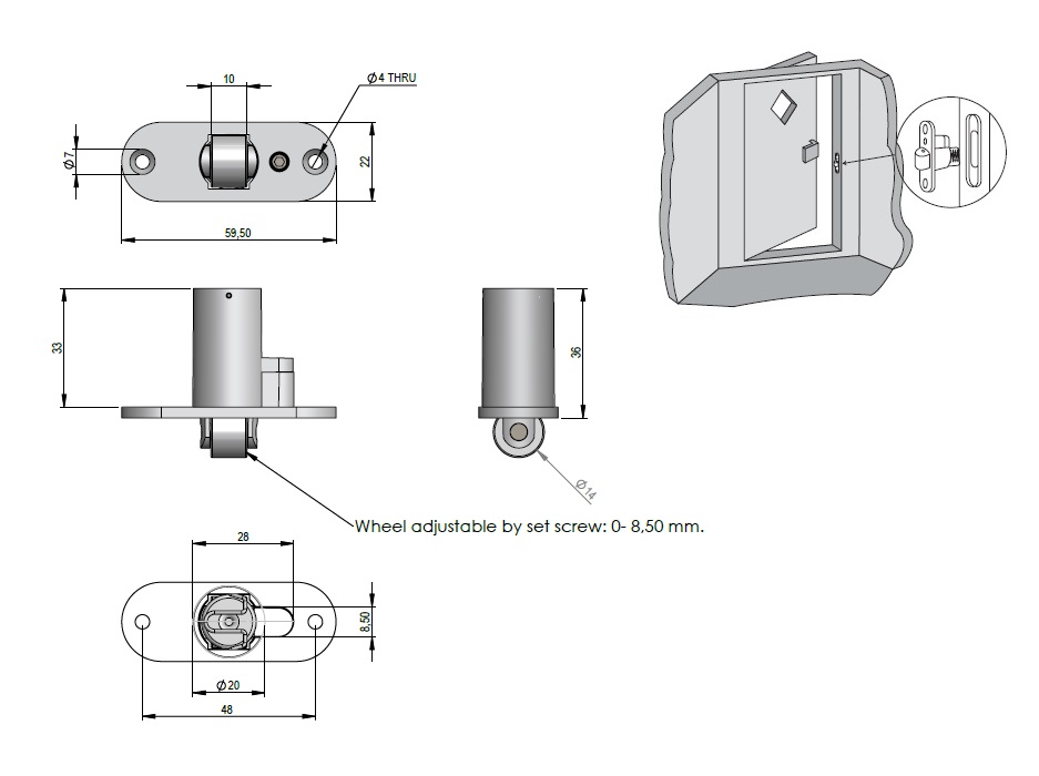Door Catch Roller "Dania", Black Matt, 60x22mm, W/Adjustment Function, Inset Hole For Body: 28X32mm, Zamak Body