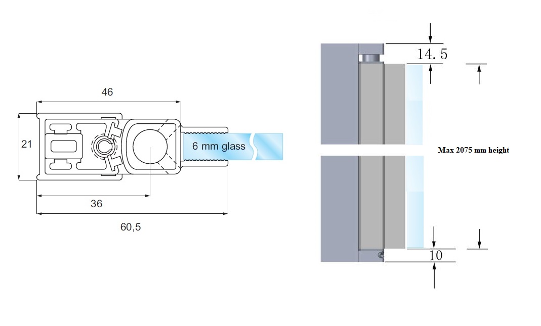 Lift Hinge "Square" Wall/Glass, Alu Finish, 2,1 Meters, All Access. Max Glass Size: 2100x800mm, Glass Thickness: 6mm, Load Capacity: 23kg