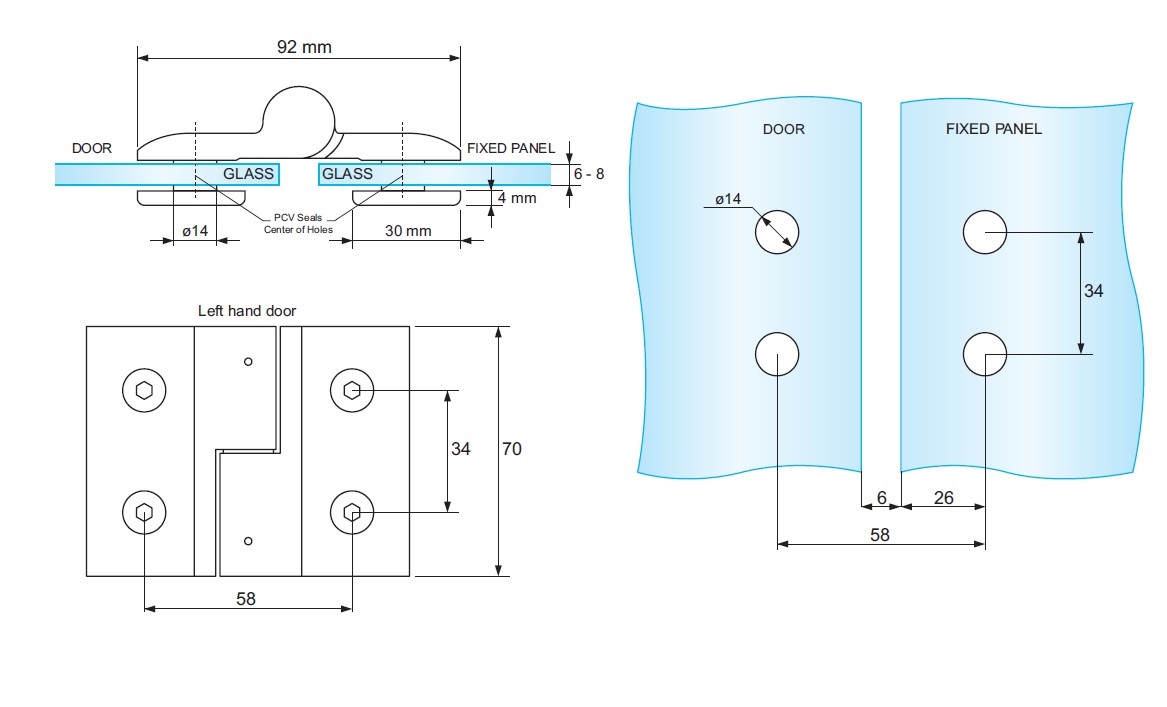 Shower Hinge "Up/Down", Alu-Look, 180DG, Left,Glass/Glass,6- 8mm Glass Thickness, ø14mm Drilling, All Brass Material