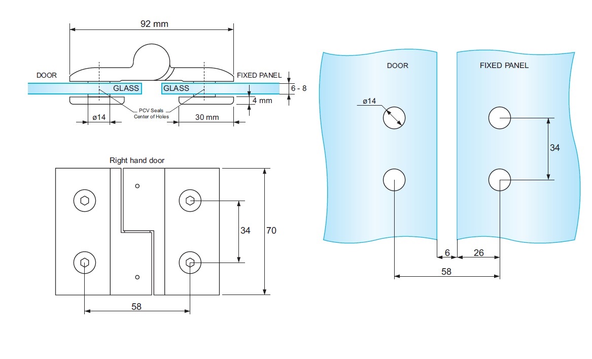 Shower Hinge "Up/Down", Alu-Look, 180DG,Right,Glass/Glass,6- 8mm Glass Thickness, ø14mm Drilling, All Brass Material