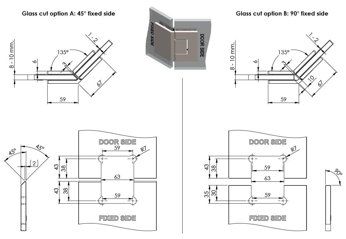 Shower Hinge "Rio", 135DG, CPL, Glass/Glass, 8-10mm Glass Thickness, W/15DG Angle Adjustment Function & 15DG Return Function, Brass Material, Hidden Screws. Black Fiber Gaskets: 2 x 1mm & 2 x 2mm Thickness. Load Capacity Pr. Pair: 45kg