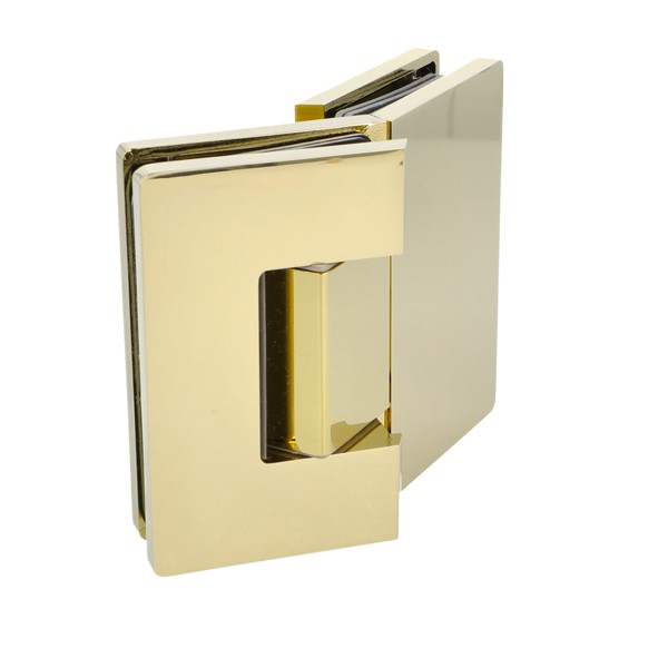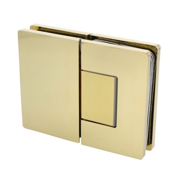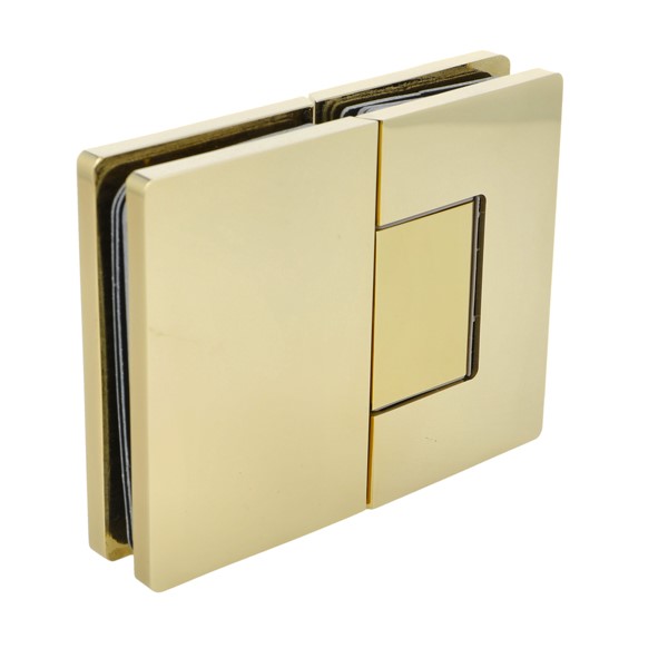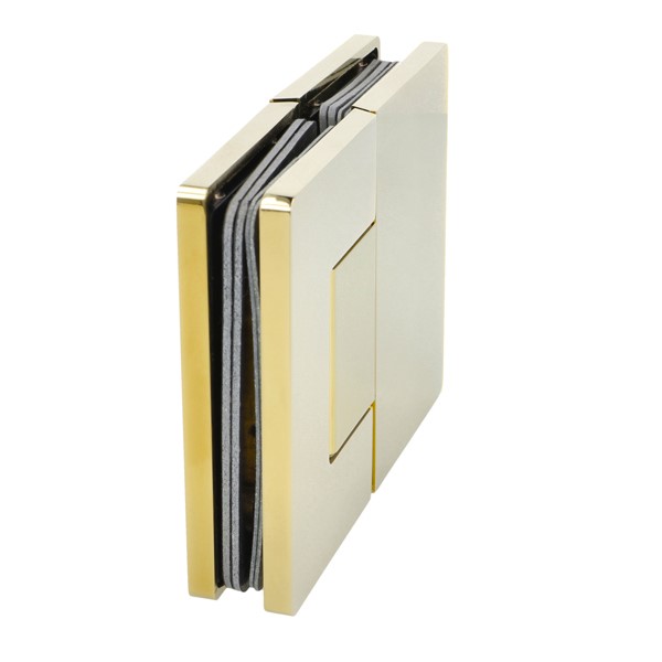 Shower Hinge "Rio", 180DG, Polished Brass, Glass/Glass, 8-10 mm Glass Thickness, W/15 DG Angle Adjustment Function & 15DG Return Function, Brass Material, Hidden Screws. Black Fiber Gaskets: 2 x 1mm & 2 x 2mm Thickness. Load Capacity Pr. Pair: 45kg