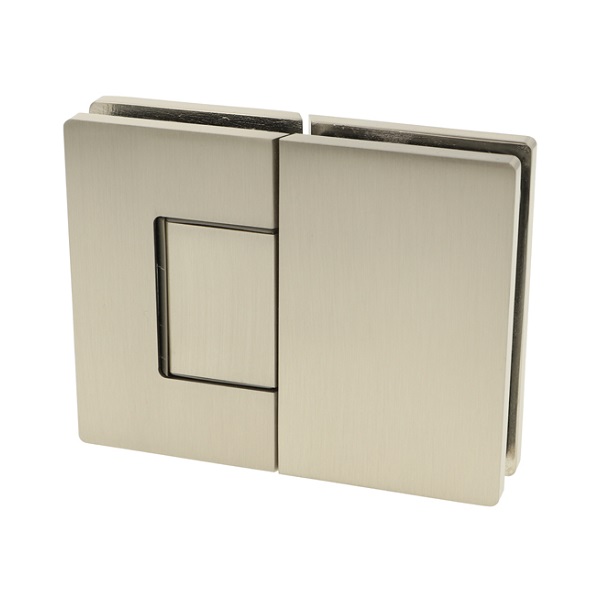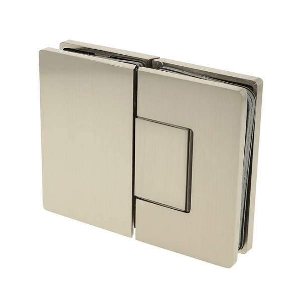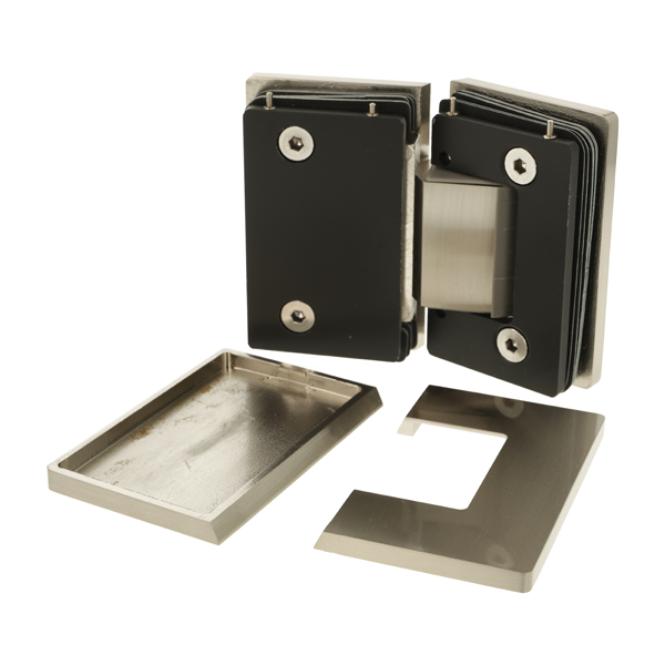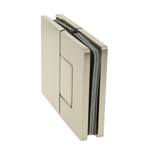 Shower Hinge "Rio", 180DG, SS-Look, Glass/Glass, 8-10mm Thickness, W/15DG Angle Adjustment Function & 15DG Return Function, Brass Material, Hidden Screws. Black Fiber Gaskets: 2 x 1mm & 2 x 2mm Thickness. Load Capacity Pr. Pair: 45kg