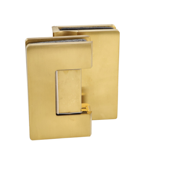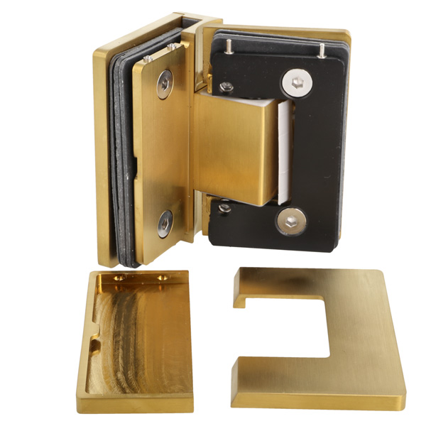 Shower Hinge "Rio", 90DG, Brushed Brass, Glass/Glass, 8-10 mm, Thickness, W/15DG Angle Adjustment Function & 15DG Return Function, Brass Material, Hidden Screws. Black Fiber Gaskets: 2 x 1mm & 2 x 2mm Thickness. Load Capacity Pr. Pair: 60kg, Max Door Widht: 1200mm.