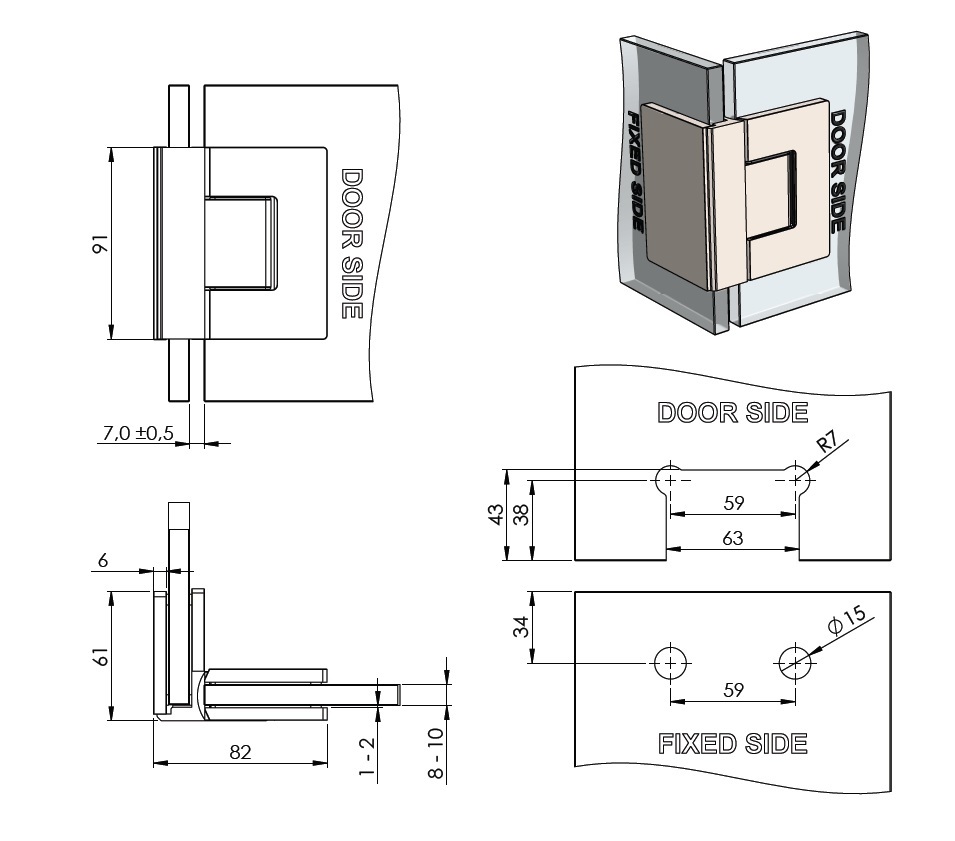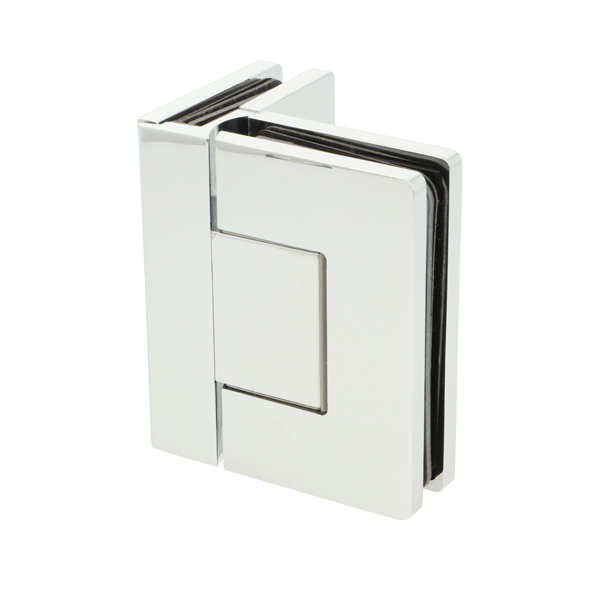 Shower Hinge "Rio", 90DG, CPL, Glass/Glass, 8-10mm Glass Thickness, W/15DG Angle Adjustment Function & 15DG Return Function, Brass Material, Hidden Screws. Black Fiber Gaskets: 2 x 1mm & 2 x 2mm Thickness. Load Capacity Pr. Pair: 45kg