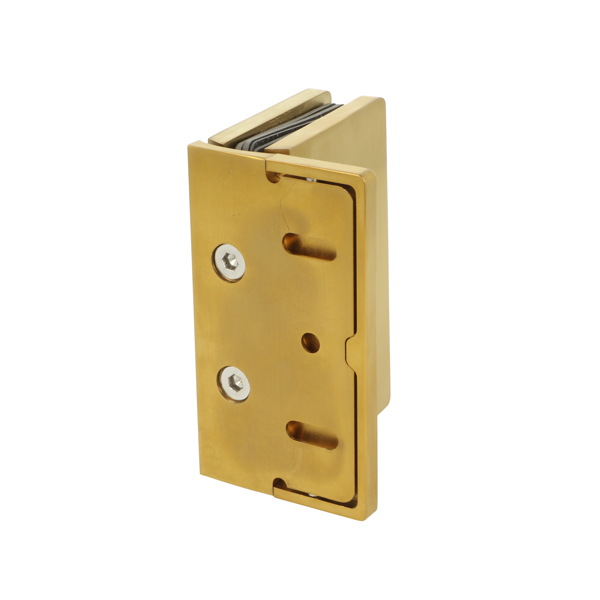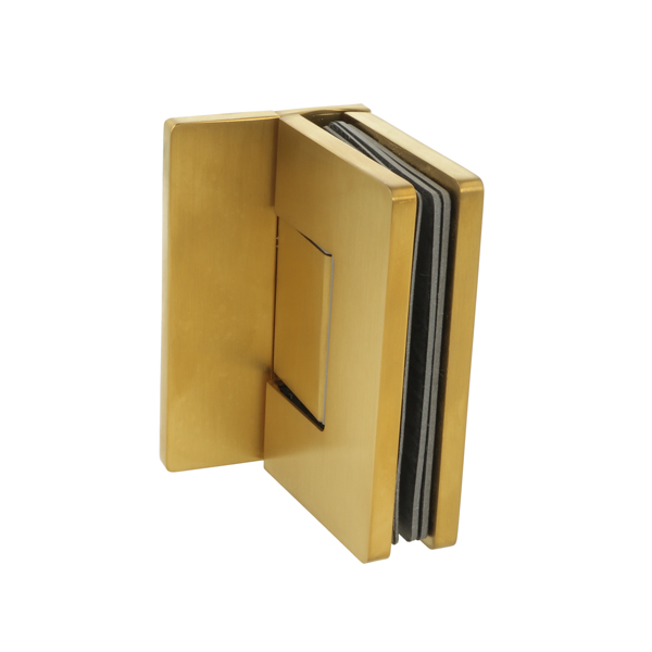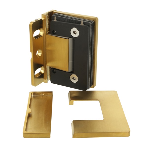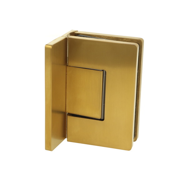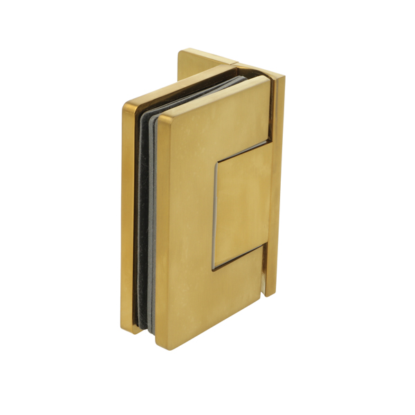 Shower Hinge "Rio", Wall/Glass, Brushed Brass, Offset Back , 8-10mm Glass Thickness, W/15 DG Angle Adjustment Function & 15DG Return Function, Brass Material, Hidden Screws. Black Fiber Gaskets: 2 x 1mm & 2 x 2mm Thickness. Load Capacity Pr. Pair: 45kg