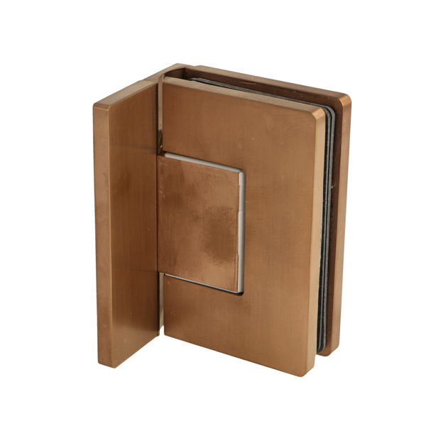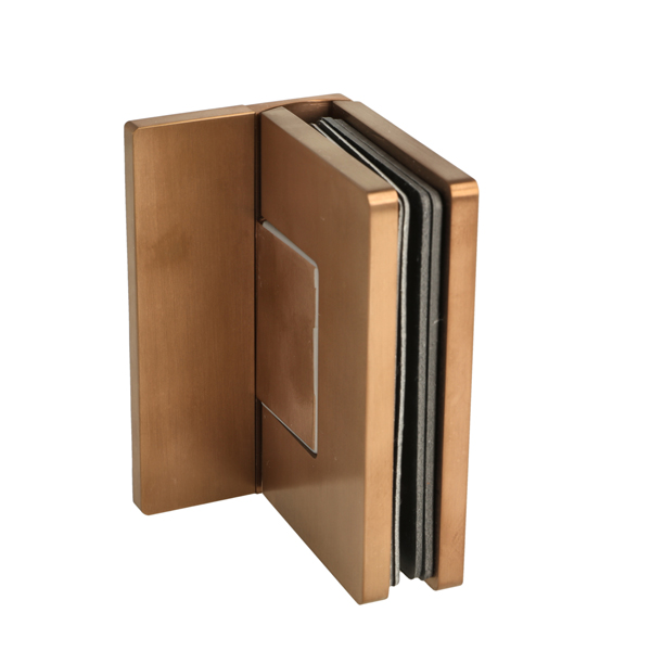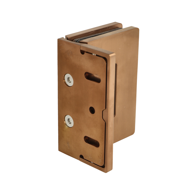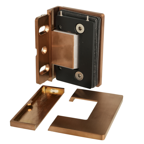 Shower Hinge "Rio", Wall/Glass, Brushed Copper, Offset Back , 8-10mm Glass Thickness, W/15 DG Angle Adjustment Function & 15DG Return Function, Brass Material, Hidden Screws. Black Fiber Gaskets: 2 x 1mm & 2 x 2mm Thickness. Load Capacity Pr. Pair: 60kg, Max Door Widht: 1200mm.