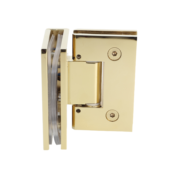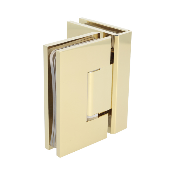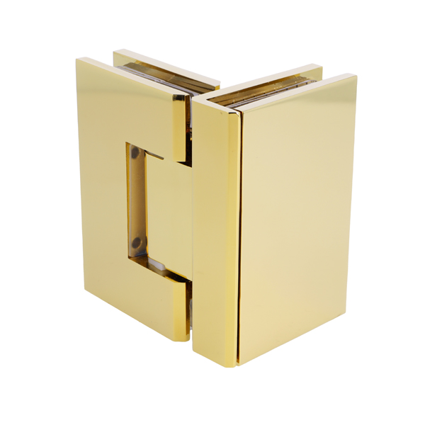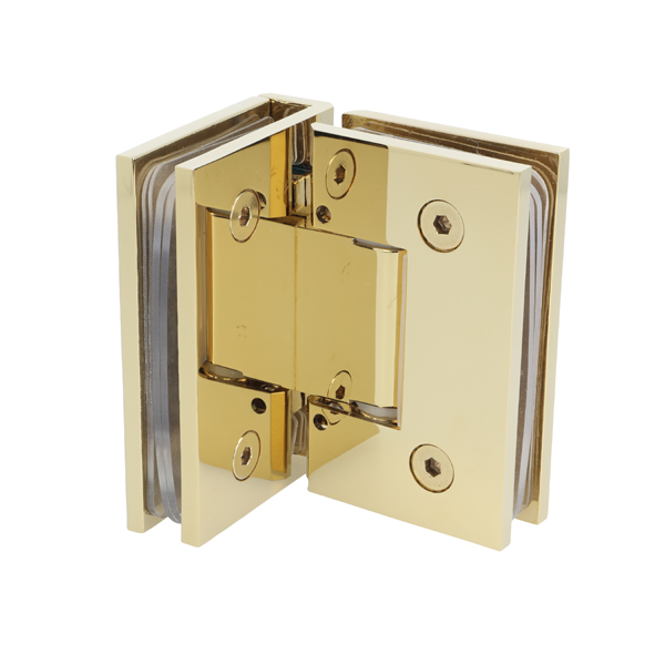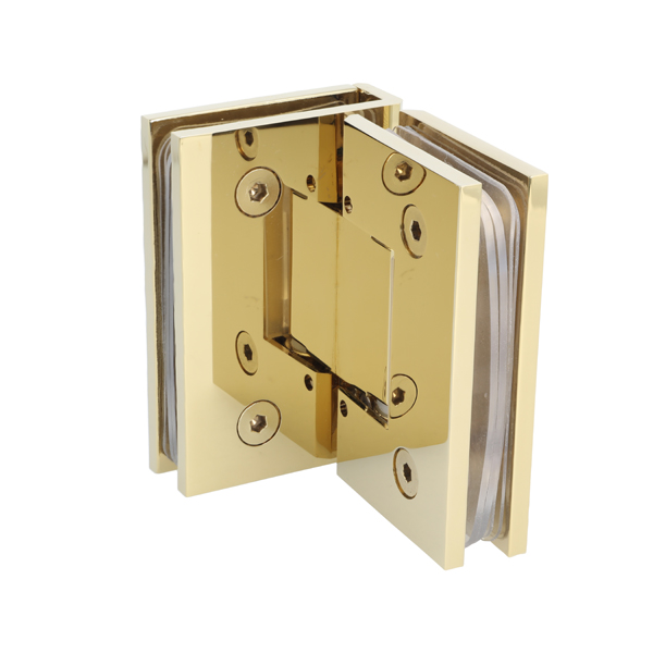 Shower Hinge "Tex III", 90DG, Polished Brass, Glass/Glass, 6-10mm Glass Thickness, W/15 DG Angle Adjustment Function & 25DG Return Function, Brass Material, Straight Edges Incl. 4 x Transp. 1mm & 4 x Transp. Cushions 2mm Thickness