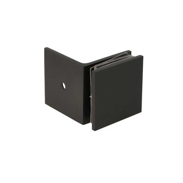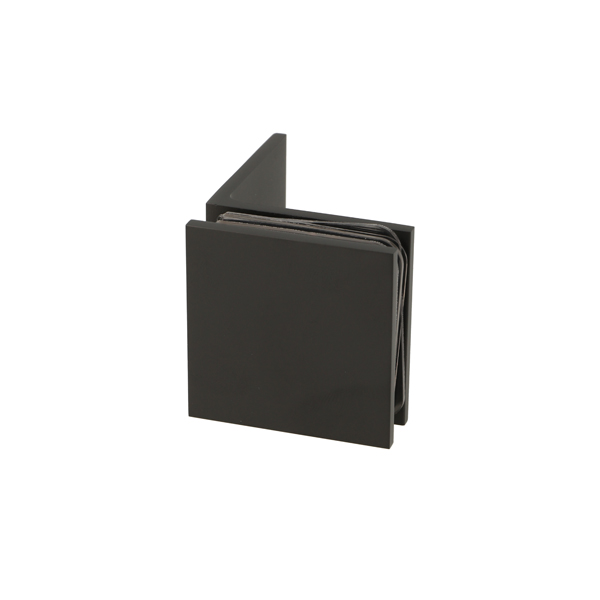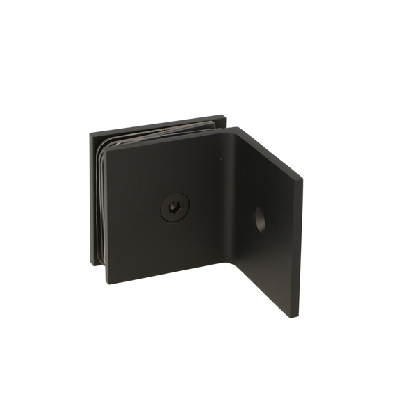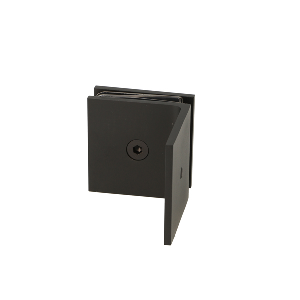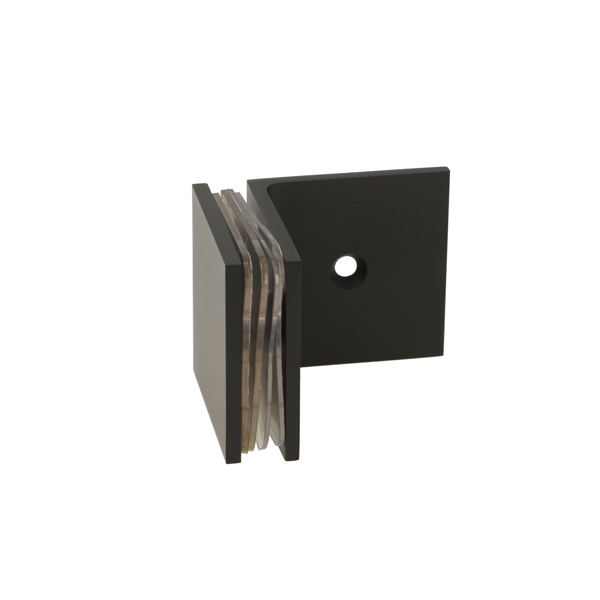Glass Clamp "Bern", 90DG, Black Finish, Glass/Wall, 51x51x17 mm, Square Corners, 8-10mm Glass, Wall Mounted By ø5mm Screw Hole, GLass Mounted By ø12mm Drilling, Brass Material