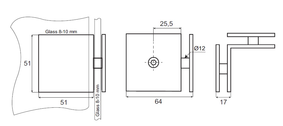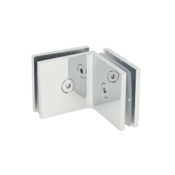 Glass Clamp "Bern", 90DG, CPL, Glass/Glass, 51x51x17mm, Square Corners, 8-10mm Glass, Glass Mounted By ø12mm Drilling, Brass Material
