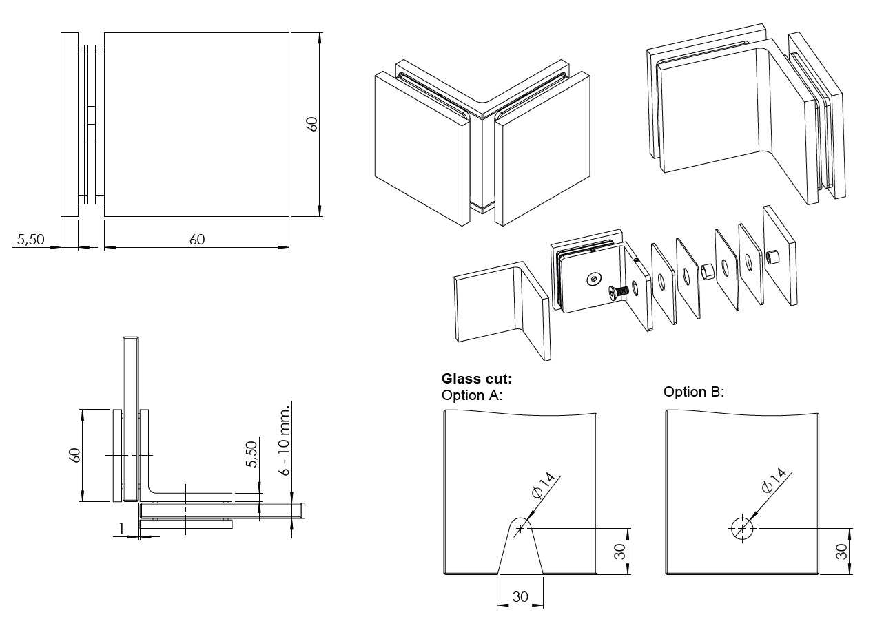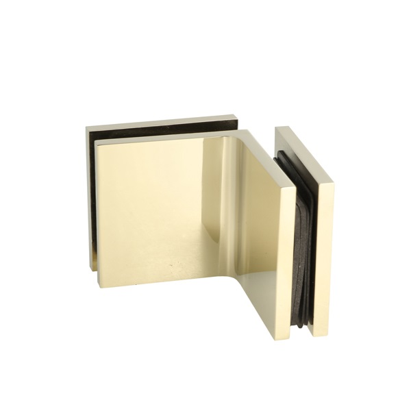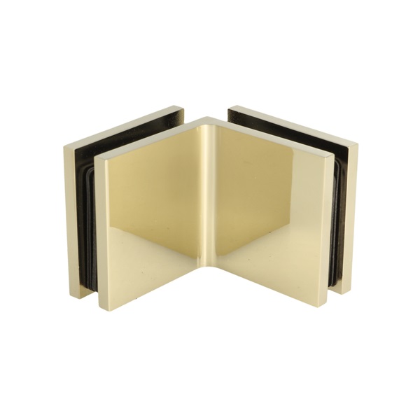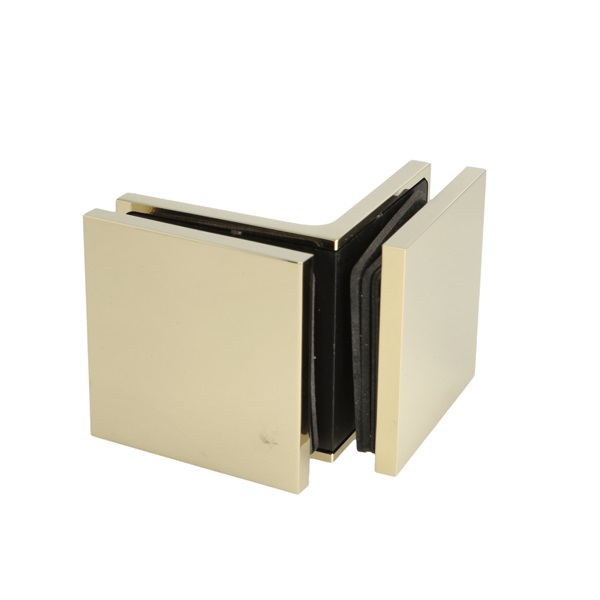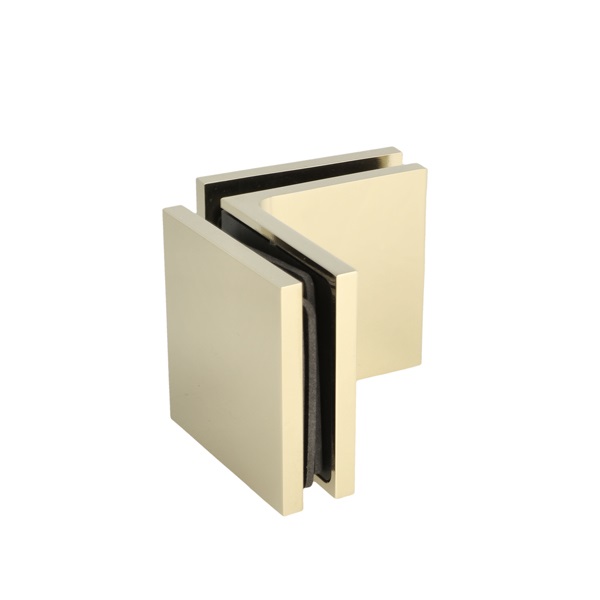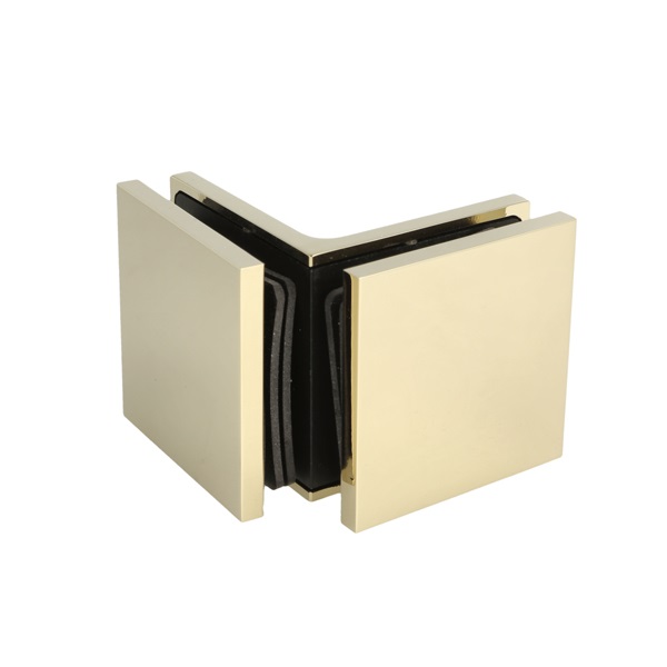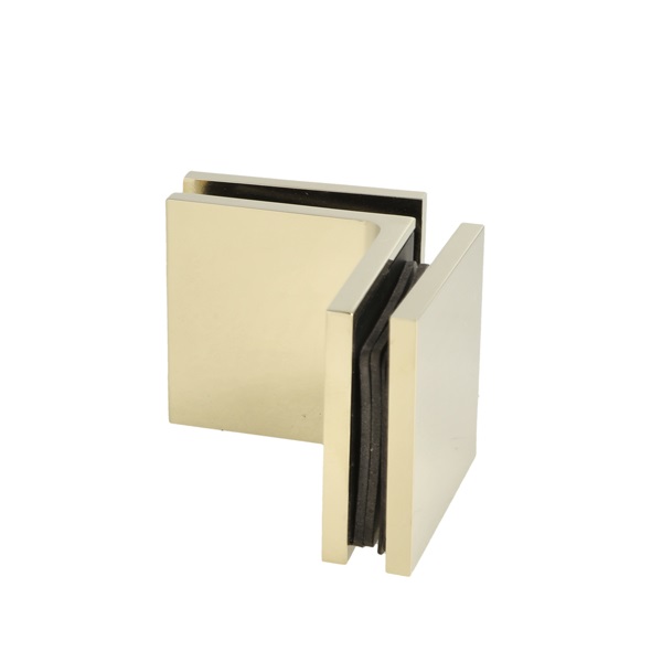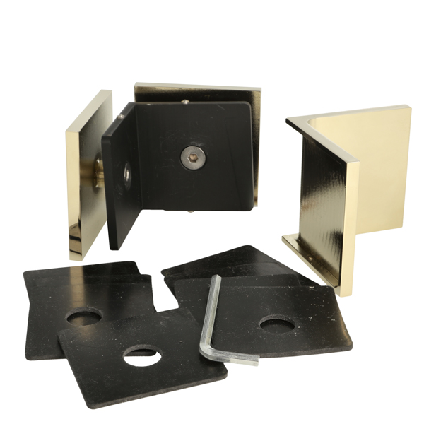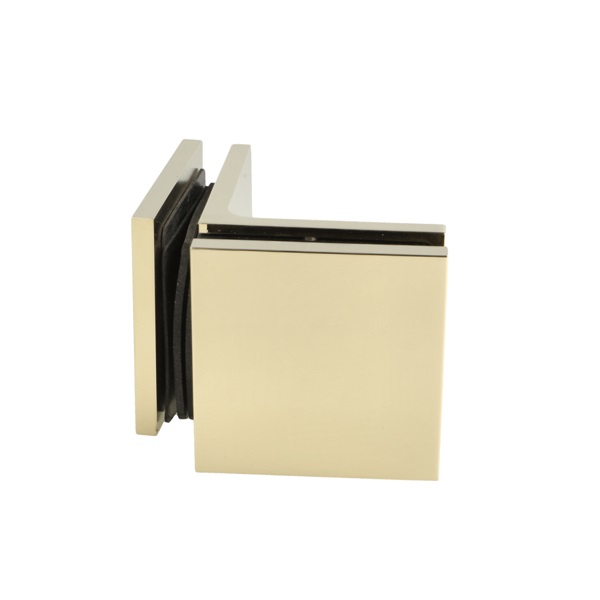 Glass Clamp "Lima", 90DG, Polished Brass, Glass/Glass,60x60x 20,5mm, 6-10mm Glass, Glass Mounted By ø14mm Drilling,Hidden Screws, Brass, Alu & SS-304 Material