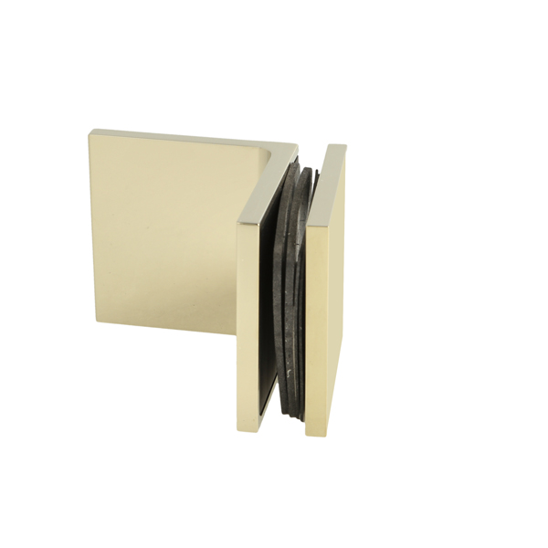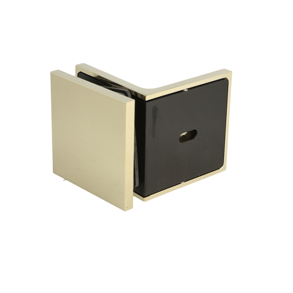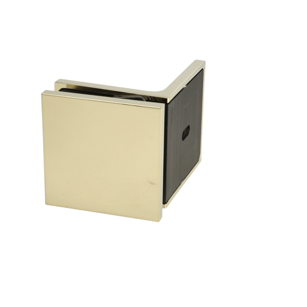 Glass Clamp "Lima", 90DG, Polished Brass, Glass/Wall, 60x60x 20,5mm, 6-10mm Glass, Wall Mounted By ø5mm Screw Hole, Glass Mounted By ø14mm Drilling, Hidden Screws, Brass, Alu & SS-304 Material