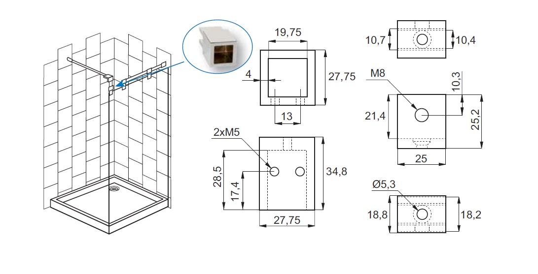 Bar To Glass Ceiling Bracket, F/19x19mm Square Tube, CPL, 8- 10mm Glass