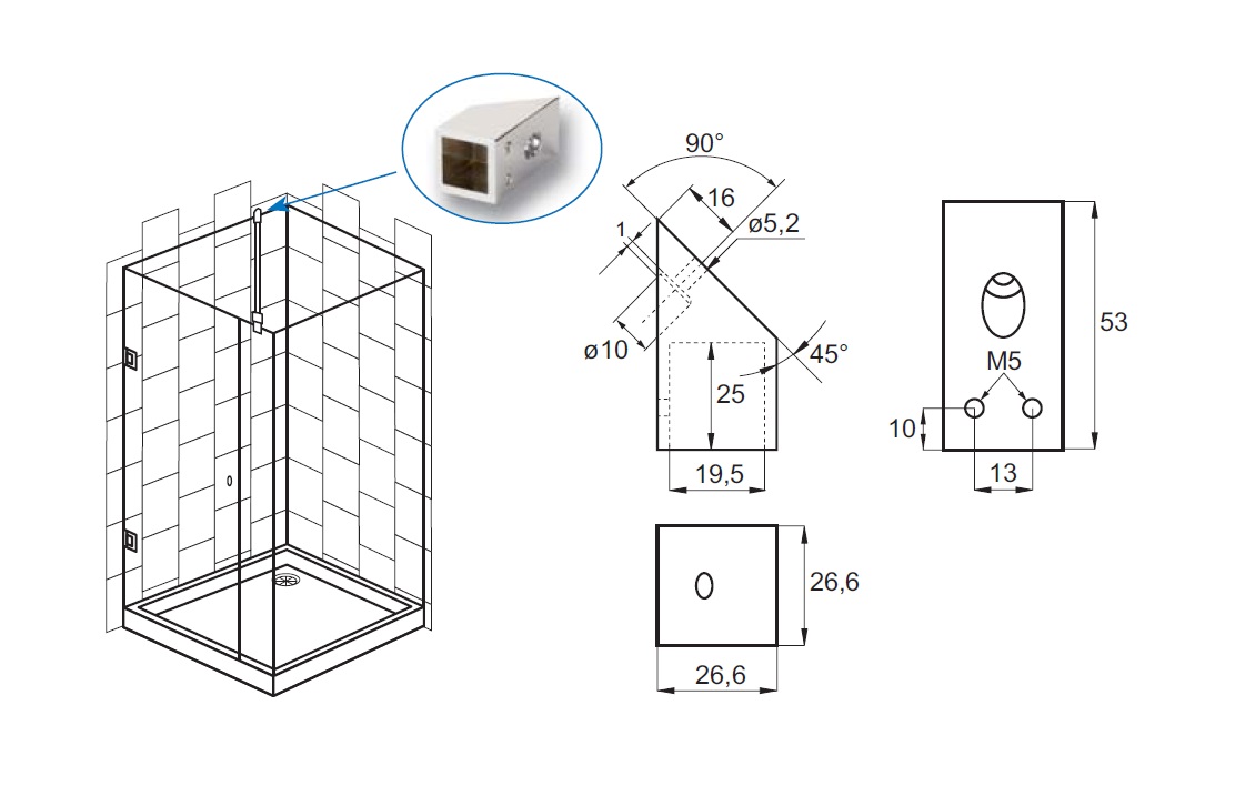 Bar To Wall Bracket, F/19x19mm Square Tube, Black Finish, 45 DG Angle
