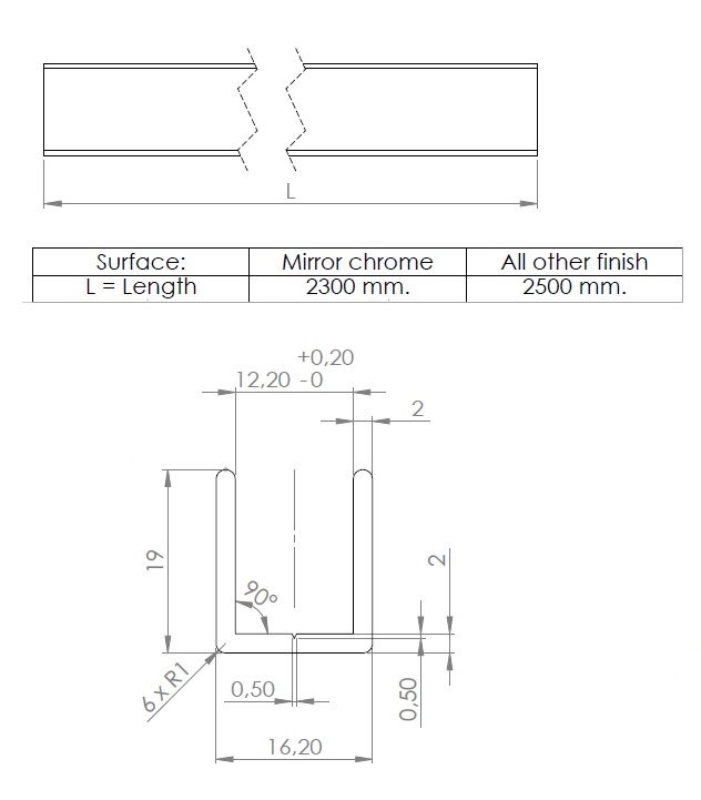 Alu. U-Channel,F/12mm Glass, Black Anod.,2,5 Mtr,2x19x16,2mm