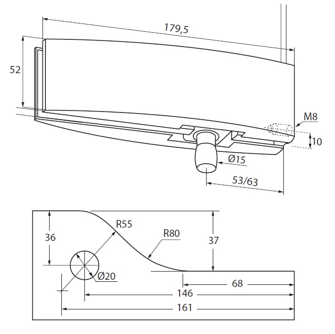 Overpanel Fitting "Lex" 52x179,5mm, Brushed SS-304 Cover,10- 12mm, Glass, w/2pcs. 1mm & 2 pcs. 2mm Gaskets(Not Glued)