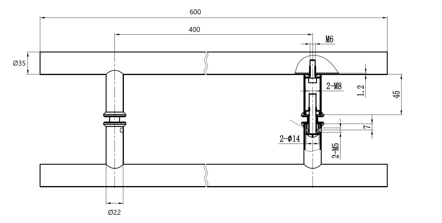 Door Handle "Oder" SS304 Brushed, ø32x600mm, cc 400mm, 8-12mm Glass Thickness, Bore: ø12mm