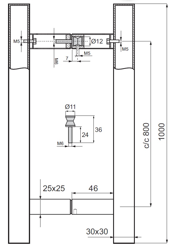 Door Handle "Sava" SS304 Polished, 30x30x1000mm, cc 800mm, 8-12mm Glass Thickness, Bore: ø12mm