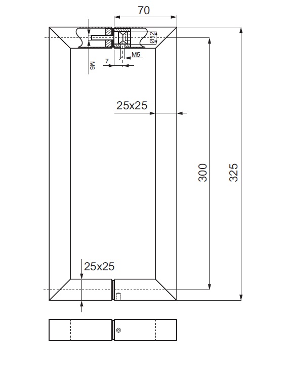 Door Handle "Tajo" SS304 Brushed, 25x25x325mm, cc 300mm, 8-12mm Glass Thickness, Bore: ø12mm