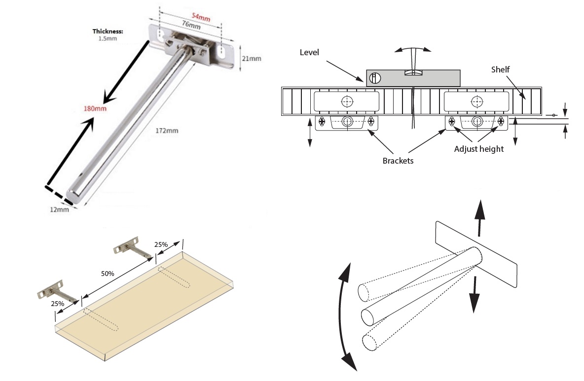 Invisible Shelf Bracket ø12x180mm, NPL, 2D Adjustable,W/Wall Plugs & Screws