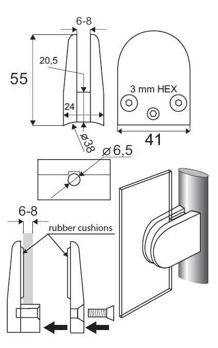 Glass Clamp, "Medium", Zamak, CPL, Bent Tube ø38mm, F/6-8mm Glass Thickness