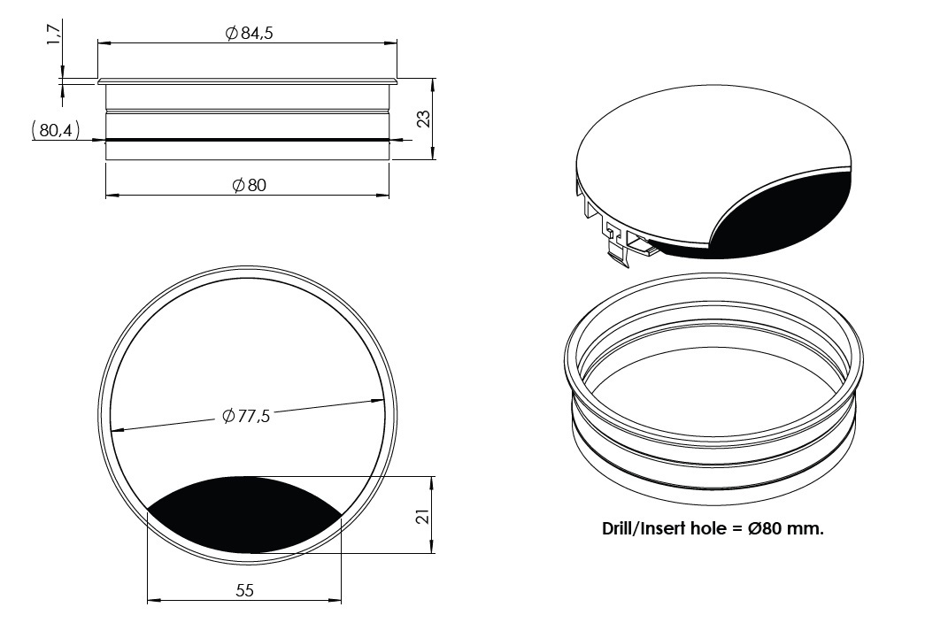 Aluminium Grommet W/Brush, ø80x22mm, Black Anodized