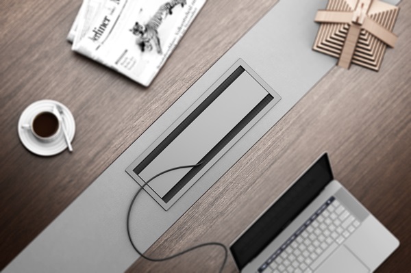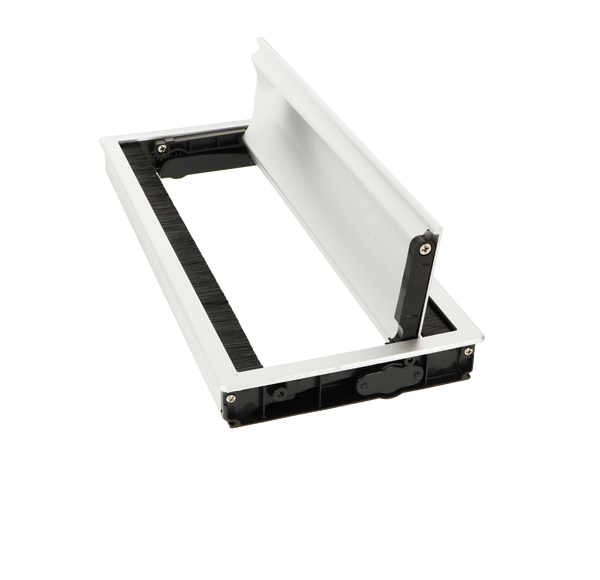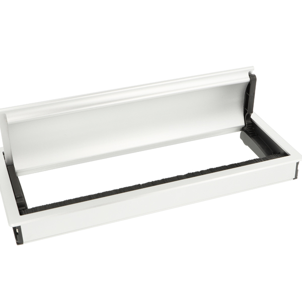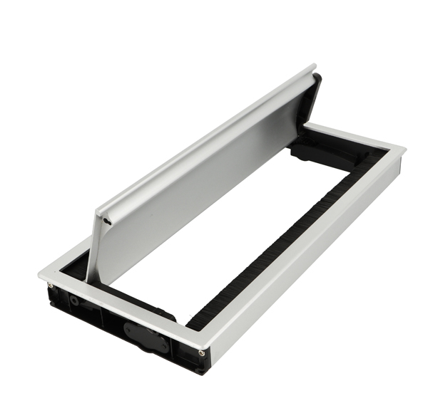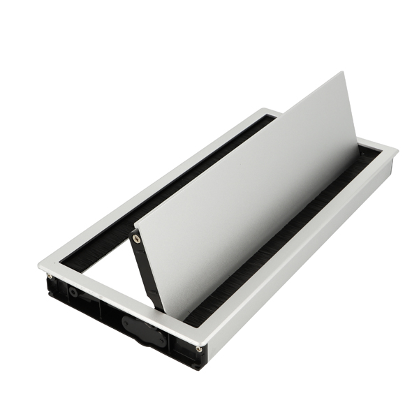Soft Close Grommet "Flip" 312,5x148x28mm, Silver (RAL9006), Aluminium, W/Brushes (Suggested Hole Cutting: 302x140mm)