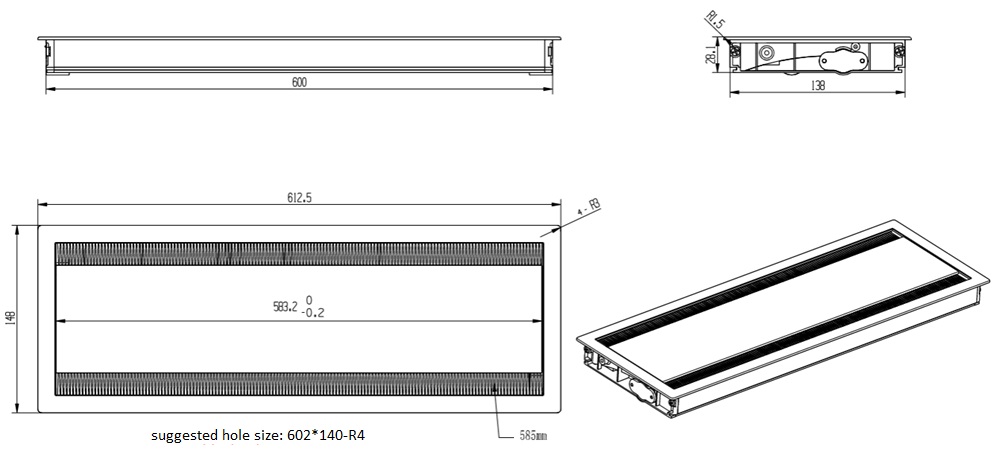 Soft Close Grommet "Flip" 612,5x148x28mm, Silver (RAL9006), Aluminium, W/Brushes (Suggested Hole Cutting: 602x140mm)