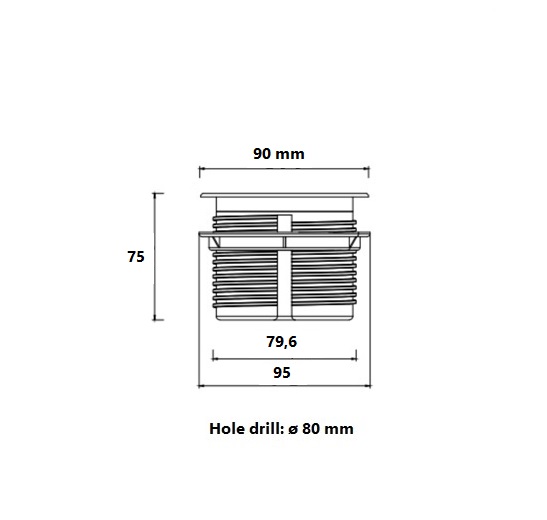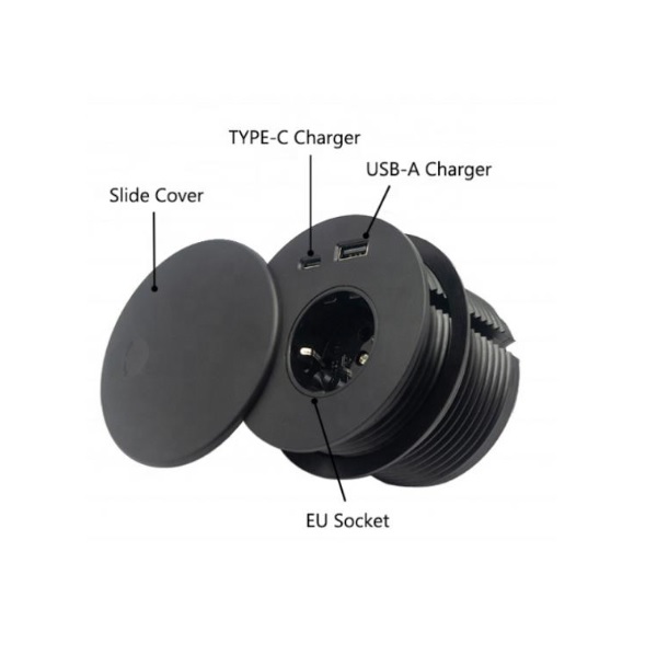 Power Socket W/Lid Cover, White, ø80mm, 1 EU Socket+2 USB Chargers (A+C), W/150 cm EU Power Cable, EC/RoSH Certified, Over all Size: 90x75x79,5mm, Hole Drill: 80mm