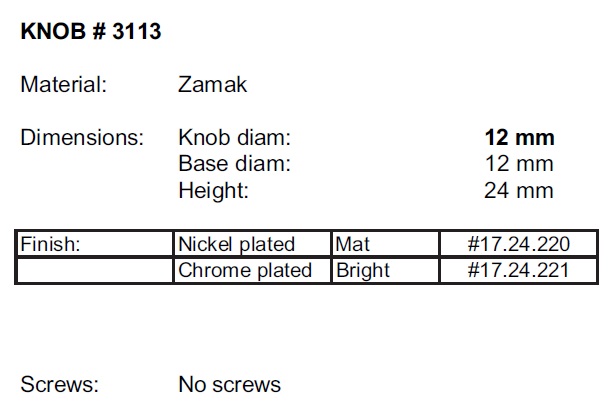 Knob 3113, ø12mm Base, Zamak, Chrome Plated, No Screw