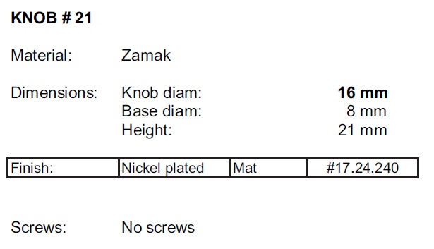 Knob No. 21, ø8mm Base, ø16mm Head, Matt Nickel Pl, No Screw