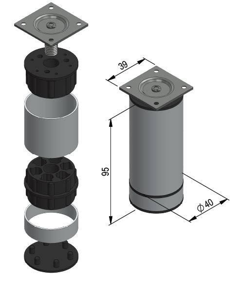 Alu Leg Jaco ø40mm, H 100mm PL 39x39x2mm, cc 29x29mm Stem: M10X27mm ,Silver Sprayed Finish