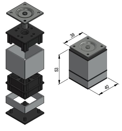 Alu Leg Niko 40x40mm, H 58mm PL 39x39x2mm, cc 29x29mm Stem: M10X27mm ,Silver Sprayed Finish