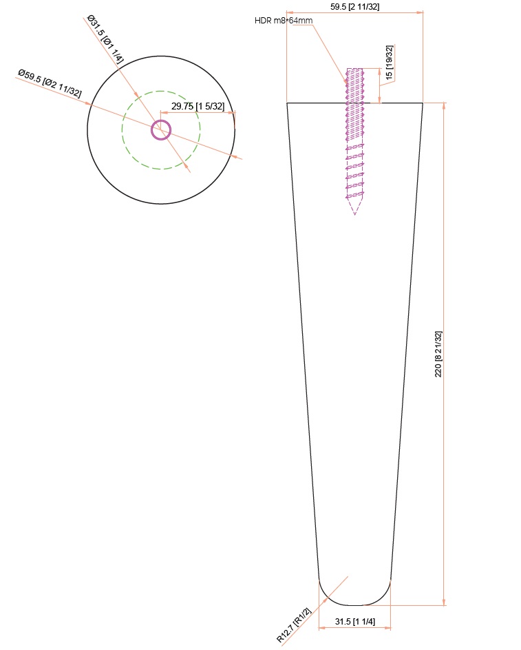 Wooden Leg "Frida", ø59x220mm, Oak - Natural, W/M8x51mm Hangerbolt, (Exposed Thread Part 15mm)