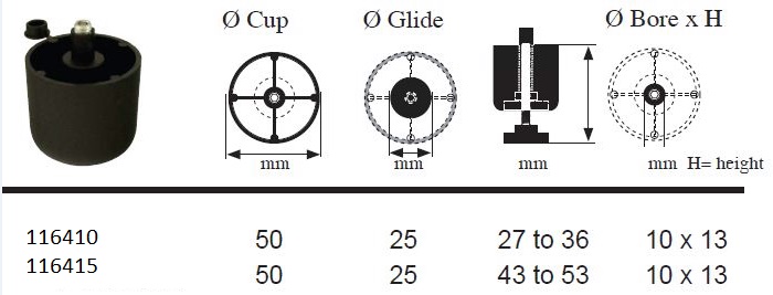 Cup Leveller ø50x25mm, W/Adj. Swing Glide ø25mm,BLK,M8x33mm Stud W/4mm Hex Hole in Top