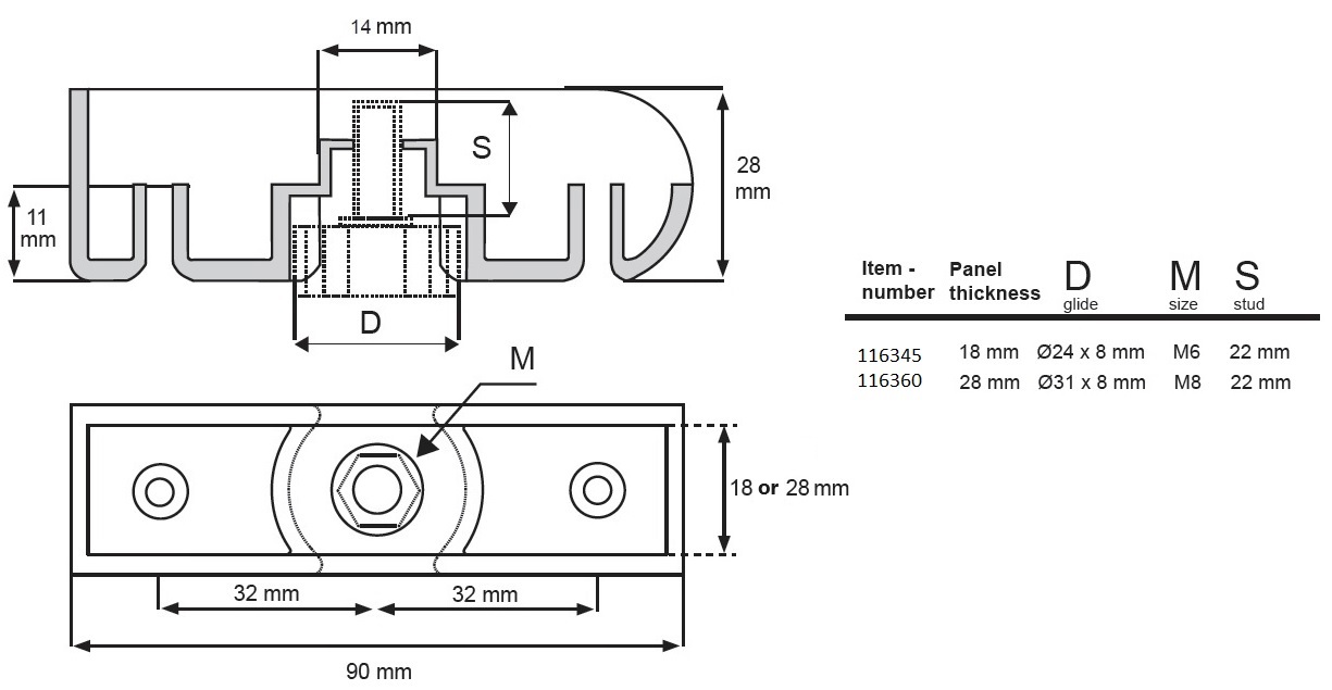 Panel Shoe W/Adjust. Glide ø31mm,BLK, Stud M8x22mm, F/28mm Panel