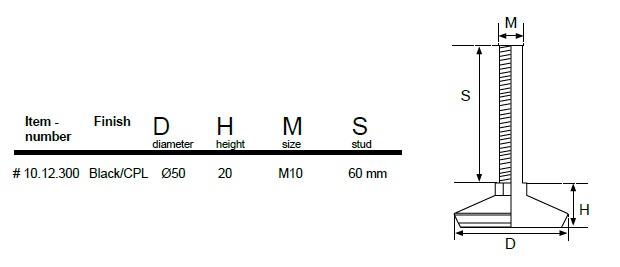 Adjust. Glide Strato ø50mm, Black Base, SS304 Cover,Stud M10 x60mm, W/Hex Nut
