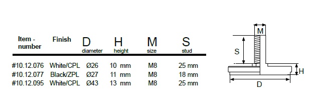 Adjust. Glide Titan, ø43x13mm, White Base, CPL Cover,Stud M8 x25mm, W/Hex Nut SW10