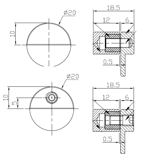 Pivot Hinge F/UV-Glue, ø20mm, SS-304-Brushed, F/Max 12mm Glass Thickness, Max Load Capacity: 10 KG, F/Inset Doors, A threaded Pin in the Hinge allows the Door to be removed after gluing