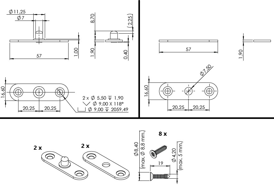 Invisible Pivot Hinge F/Slat, 360DG Rotation, SS201, 57x16x 1,8mm, Incl. 4 SS-201 Screws M4x19mm, Sold pr. Pair, Steel, Ideal for Room Dividers or Cabinet Doors